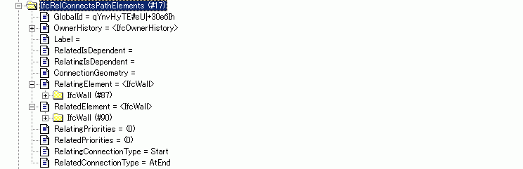 「IfcRelConnectsPathElements」はオブジェクトの接続関係を表わしたもので、上位から継承する8個の属性「GlobalId」、「OwnerHistory」、「Label」、「UserDefinedType」、「DocumentReferences」、「ConnectionGeometry」、「RelatingElement」(関係する側の要素)、「RelatedElement」(関係される側の要素)と、自身で定義する4個の属性「RelatingPriorities」(関係する側の順序)、「RelatedPriorities」(関係される側の順序)、「RelatingConnectionType」(関係する側の接続形態)、「RelatedConnectionType」(関係される側の接続形態)を持つ。