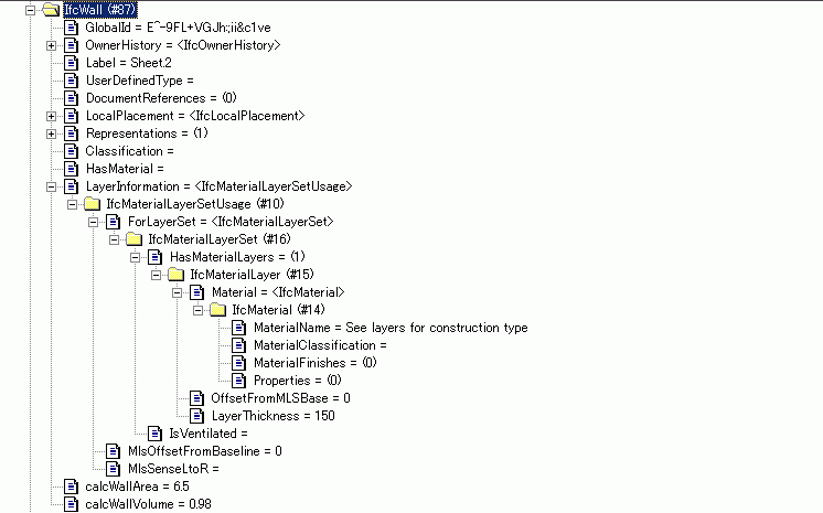 「IfcMaterialLayerSetUsage」は材料の層の組み合わせの使い方を表わすもので、3個の属性「ForLayerSet」(材料の層の組み合わせ)、「MlsOffsetFromBaseline」(オフセット寸法)、「MlsSenseLtoR」(層の方向)を持つ。