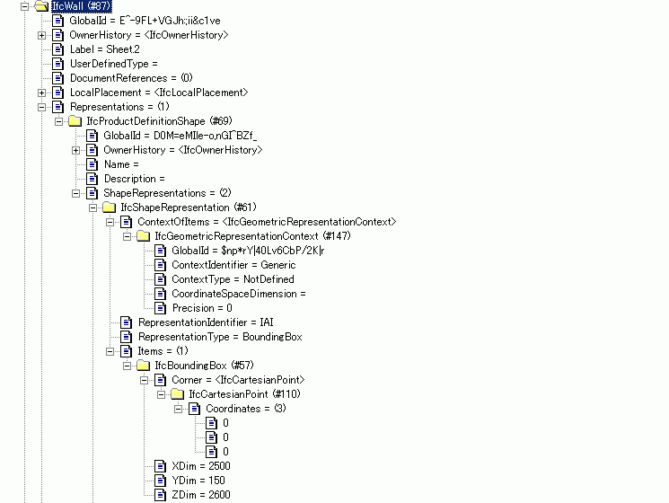 「IfcGeometricRepresentationContext」は幾何表現文脈を表わすもので、上位から継承する3個の属性「GlobalId」、「ContextIdentifier」、「ContextType」と、自身で定義する2個の属性「CoordinateSpaceDimension」(座標空間次元)、「Precision」(精度)を持つ。