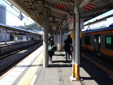 写真 中央線の駅構内と車両(2024年10月12日10時10分頃、高尾駅にて)