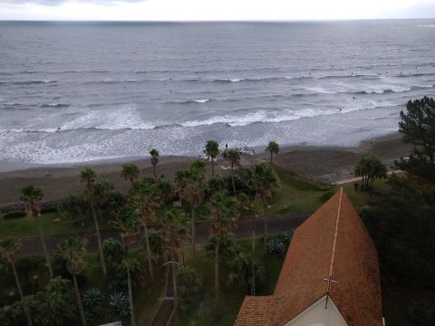 海を眺めると、サーファーがたくさんいる。