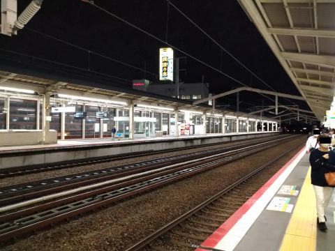 ホームから見える「揖保乃糸」の広告が夜空に燦然{さんぜん}と輝いていて、ステキ。