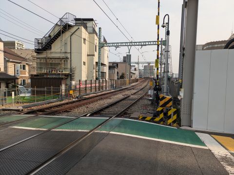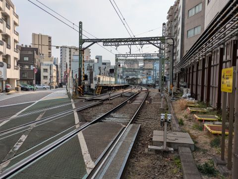写真 京浜急行電鉄の軌道と駅舎(2025年3月26日15時頃、北品川駅付近にて)
