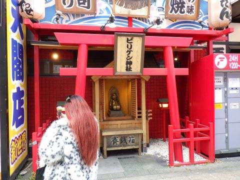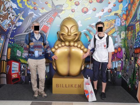 通天閣の中はビリケンさんだらけだけど、裏手の商店街もビリケンさんだらけ。ビリケンさんは外人さんやでぇ、とマゴにも言っておいた。