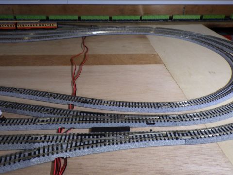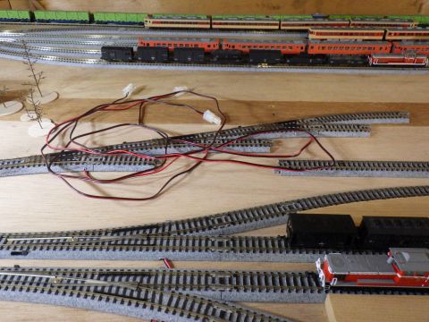 さらに、ポイントの配線を外線と中線にくぐらせて、