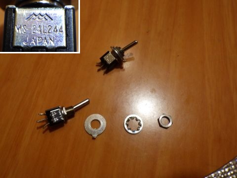 そーゆースイッチなら、たくさん持ってるさぁ。型番はMS-24L244で、容量は3A125Vで、メイドインジャパン。ずいぶん昔に、同好の先輩にいただいたもの。ありがたいなぁ。
