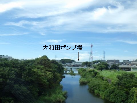 京成大和田と1駅先の勝田台の間で、西印旛沼と東京湾を結ぶ新川を渡る。大和田ポンプ場も見える。