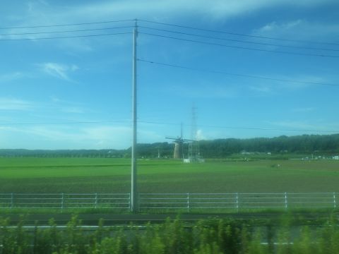 京成臼井と1駅先の京成佐倉の間で、佐倉ふるさと広場の風車が見えた。なんちゃって風車じゃなくて、本格的な風車らしい。