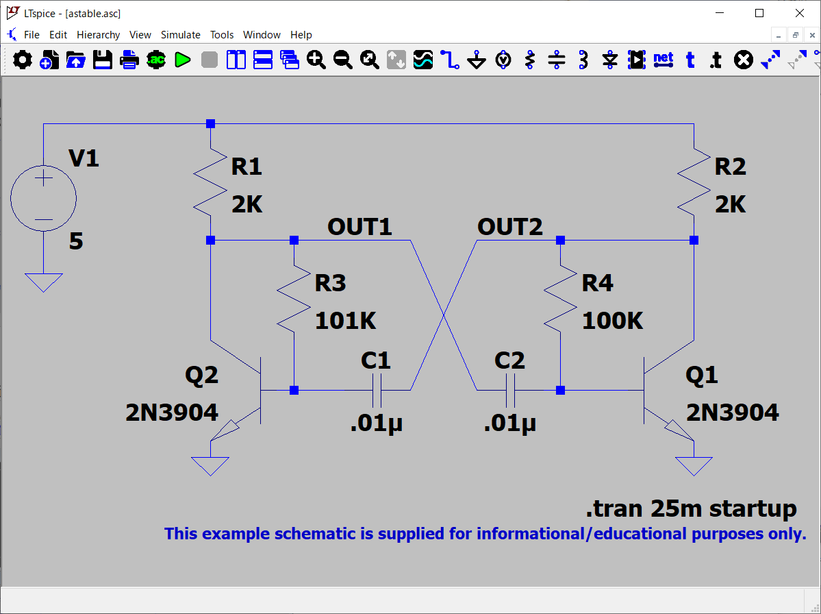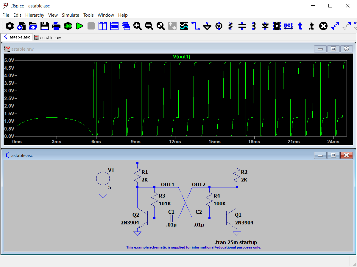 サンプルを探すと、「astable(無安定)」の回路があった。そのものズバリじゃん。さすがに、これなら、