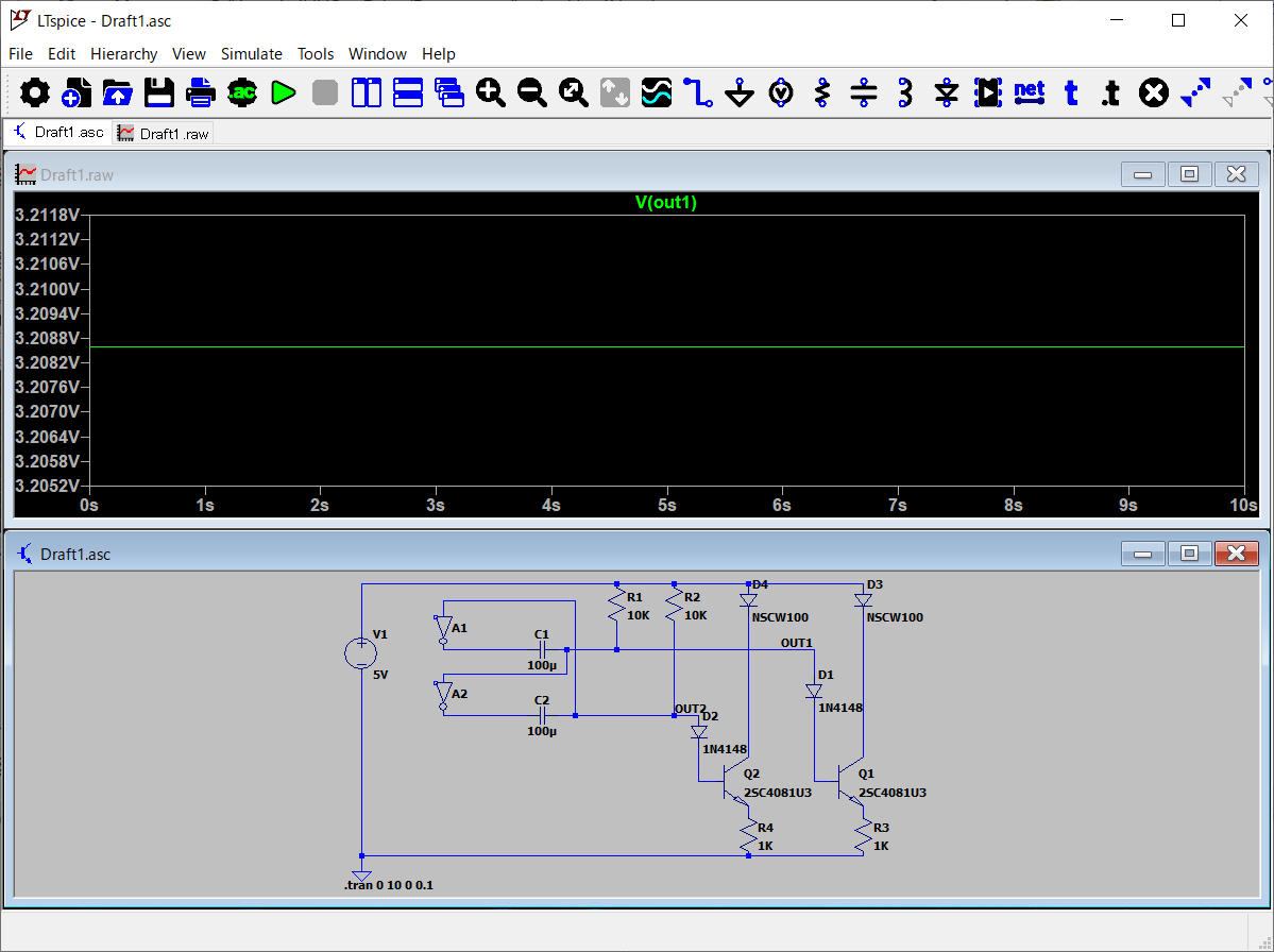 無安定マルチバイブレータの出力は、どちらも3.2Vほど。いや、本来は片方でしょーに。うーむ。