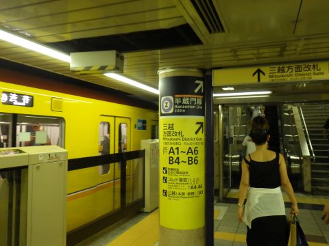 写真 東京メトロ銀座線の駅構内と車両(2025年8月3日18時頃、三越前駅にて)