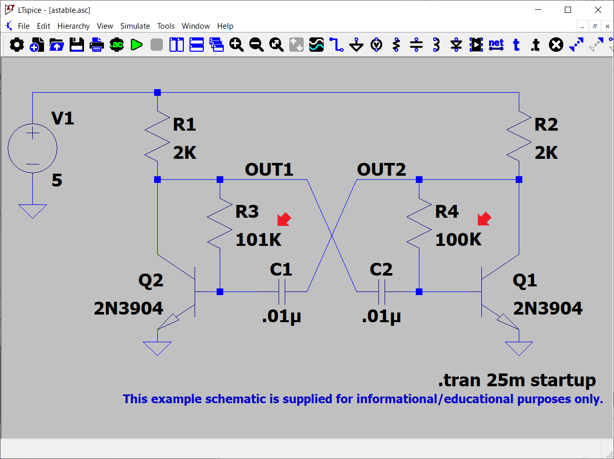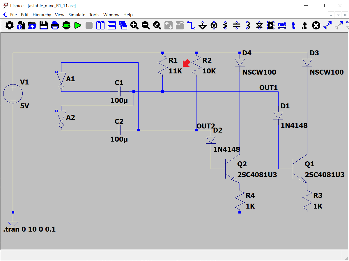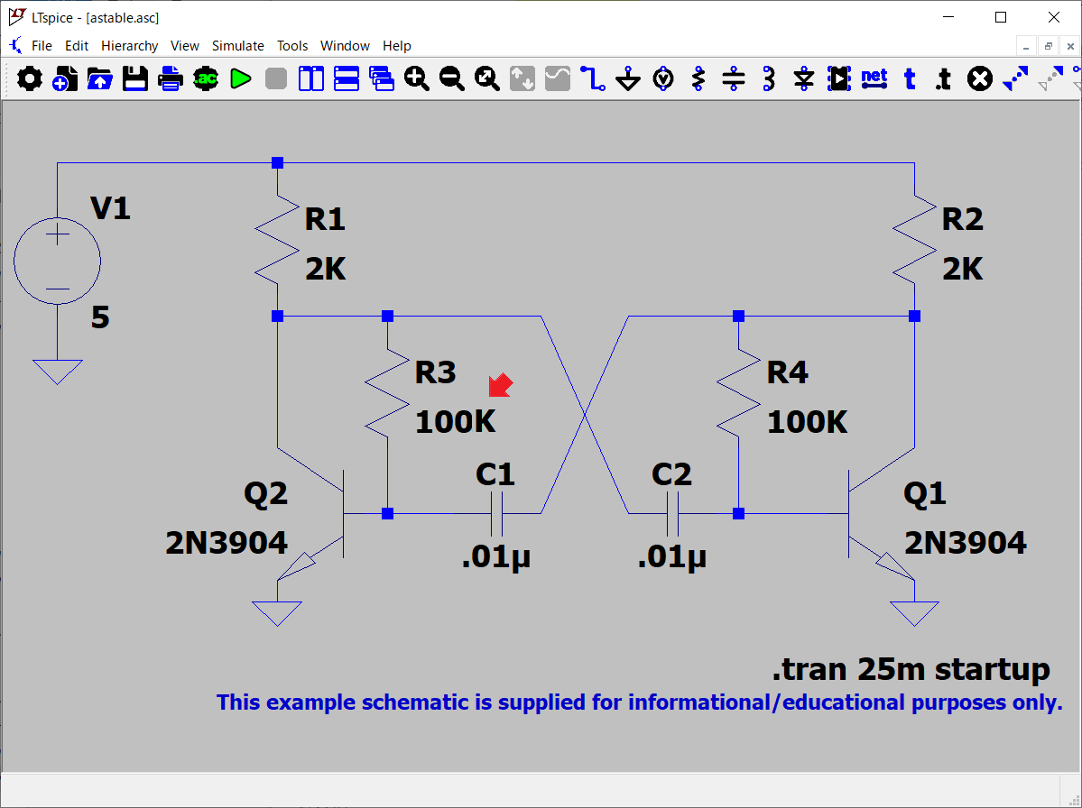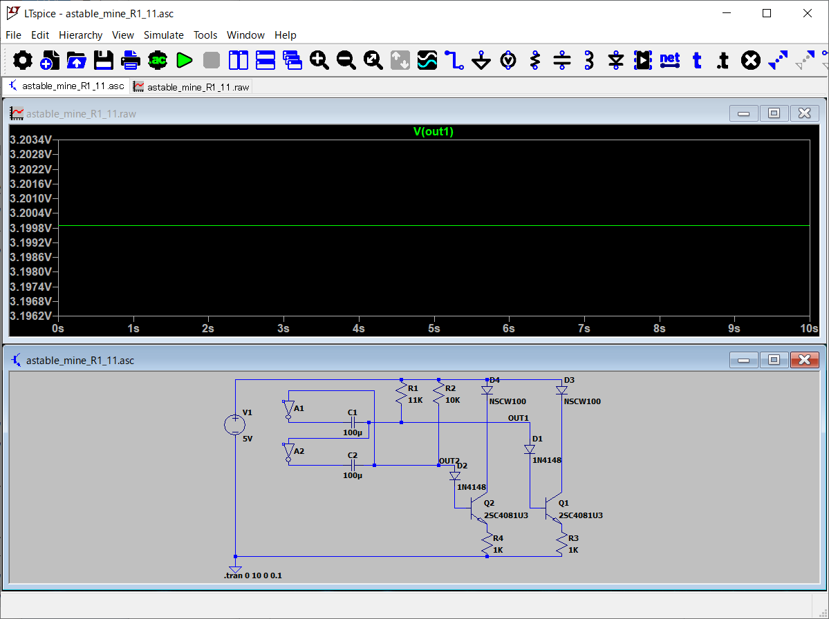実物では、Q1側のR3とQ2側のR4とか、同じくC1とC2とかにビミョーな違いがあるので、Q1とQ2のどちらかが先にONになって発振するけど、ソフトにはビミョーな差がないので、発振しないってコトかな。