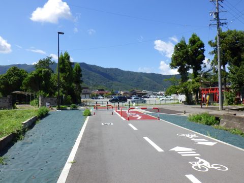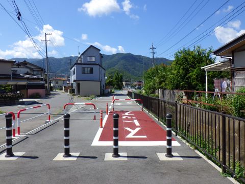 バス停から進むと、ちょっと変わった道に当たった。これって、もしかして、長野電鉄の屋代{やしろ}線の廃線跡じゃないの?