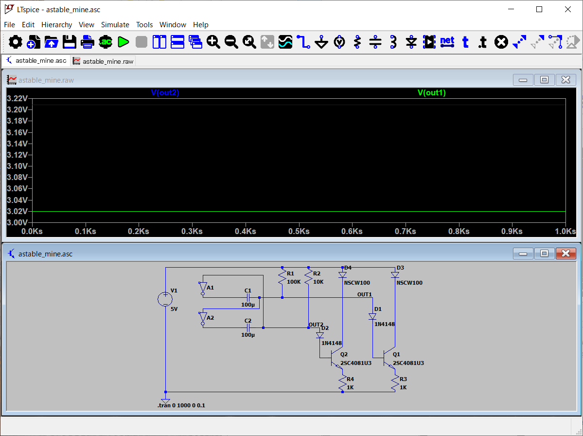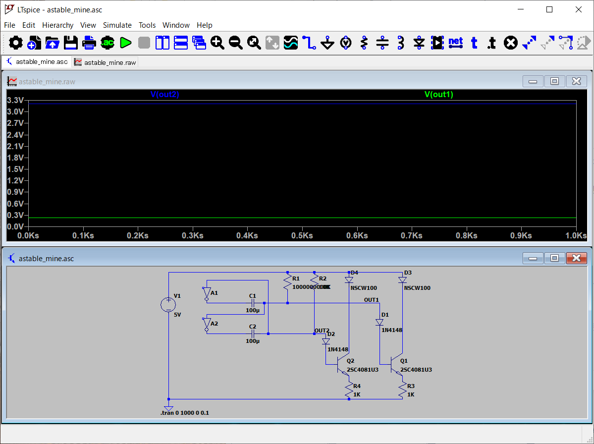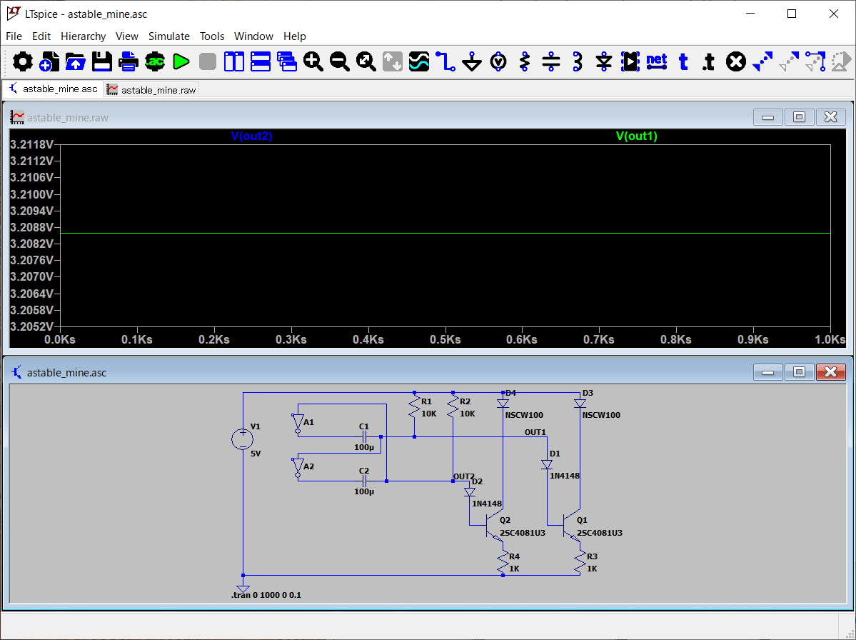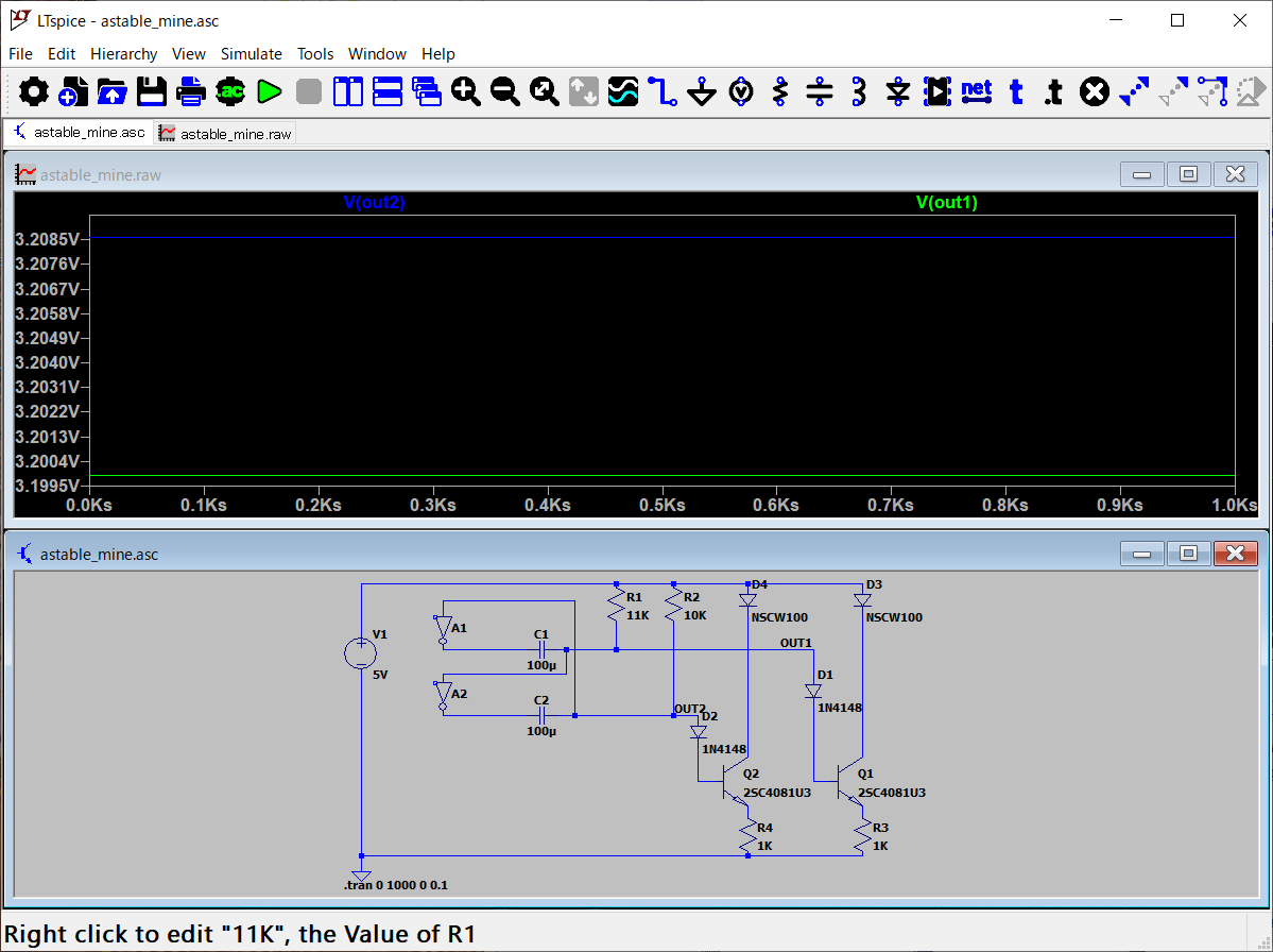 同じく、全然発振しない。でも、OUT1の値(0.3285V)とOUT2の値(0.3200V)に差が出た。