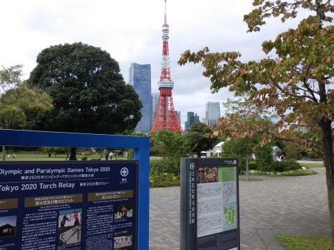 写真 芝公園と東京タワー(2025年10月6日11時50分頃、芝公園駅付近にて)