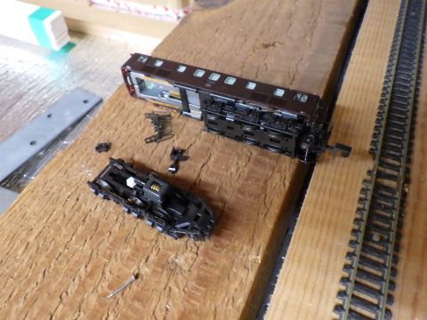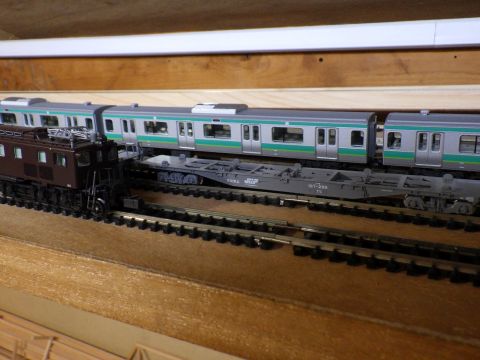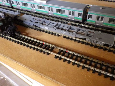 と思ったら、フレキレールと直線レールのつなぎ目辺りで脱線。むーん。