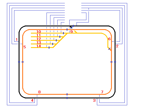 続いて、内回り線(6)に給電して、機関車を内回り線(6)から(7)の方向へ。