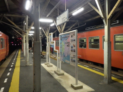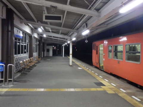 写真 山陰線の駅構内と車両(2025年12月17日19時頃、東萩駅にて)