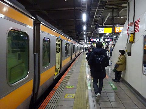 写真 中央線の駅構内と車両(2022年3月11日10時50分頃、立川駅にて)