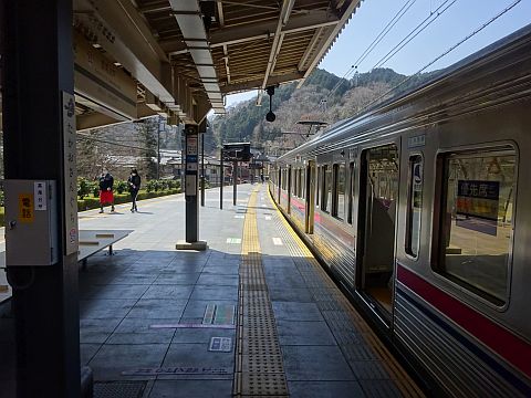 写真 京王電鉄高尾線の駅構内と車両(2022年3月24日11時10分頃、高尾山口駅にて)