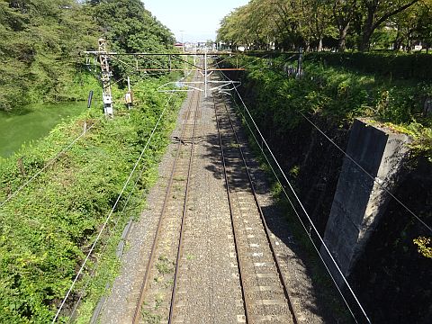 山形城の二の丸大手門に架かる橋の下に、奥羽線の軌道が見える。