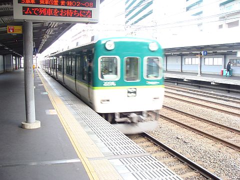 写真 京阪電鉄本線の駅構内と車両(2015年2月21日16時10分頃、門真市駅にて)