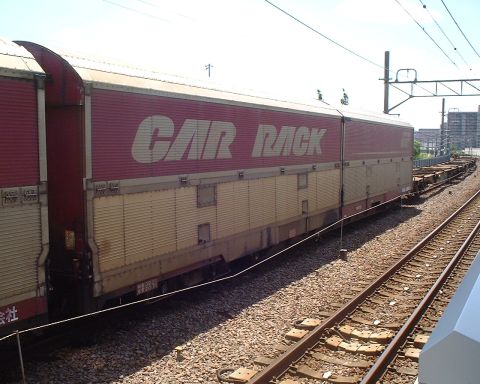 コキ71、CAR RACK。最近読んだばかりの雑誌に載っていたヤツだ。超低床式のコンテナ・自動車運搬車だ。