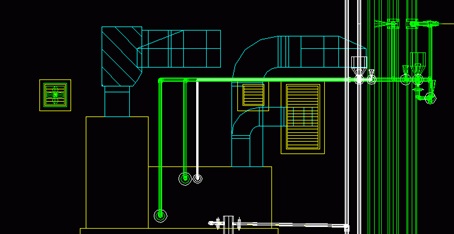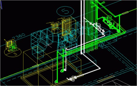 なお、干渉確認はBIMが登場する以前からも行われ、それには総合図(意匠・構造・設備が統合された図面)が利用されてきた8)。総合図は1990年頃から普及し、長年利用されてきたものであるため、総合図でも足りると言えば足りる。しかし、2次元の図面である総合図と3次元のBIMでは、可視性、即ち「見える化」の度合いにおいて圧倒的な差がある。例えば、機械室内の空調機器及びダクト・配管等の表現において、図1. 5及び図1. 6のような2次元の表示(平面図と立面図)と図1.7のような3次元の表示(鳥瞰図)を比較すれば、一目瞭然である。