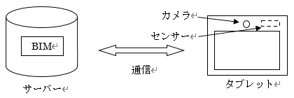 図において、サーバーにBIMが置かれ、施工現場にタブレットが持ち込まれる。タブレットにおいて、施工済みの設備部材の映像がカメラにより取得され、またカメラの位置と方向の情報が地理センサーと角度センサーにより取得され、両者がサーバーに送信される。サーバーにおいて、カメラの位置と方向の情報から、カメラから見たBIMの3次元画像が生成されると同時に、撮影された実物の映像との比較により両者の相違点が判別され、タブレットに送信される。また、相違点の有無、及び確認が終了した範囲がBIMに記録される。タブレットにおいて、実物の映像とサーバーで生成された画像、及び両者の相違点が表示される。これにより、施工された実物が計画通りであるかどうかを確認する業務が簡便かつ確実に行われる。なお、タブレットに代えて、ウエラブル端末等も利用できる。この他にも、新しい技術をBIMと組み合わせることにより、いろいろなシステムが考えられる。