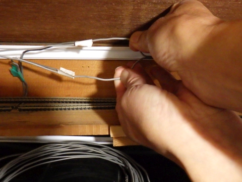 さらに、配線モールの蓋を外しながら、マーキングしながら、配線を押さえながら。